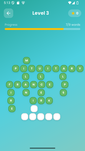 - Progress Through Levels: Each level contains multiple words to discover. Complete enough words to unlock the next level and earn stars based on your performance.